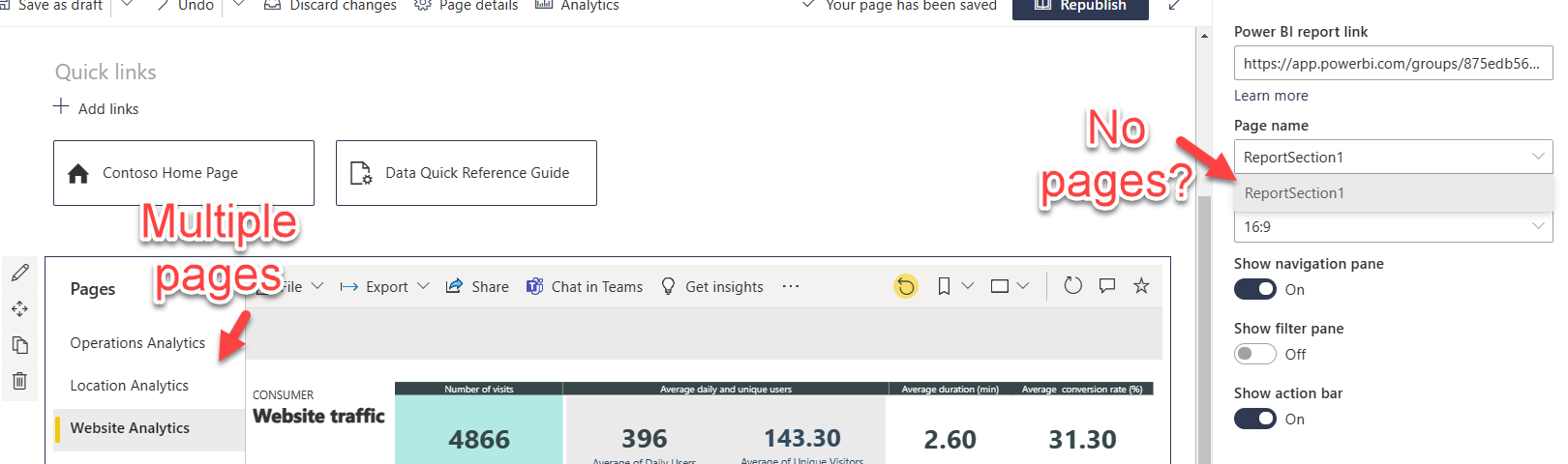 If you’ve just copied your multi-page Power BI report’s URL and pasted into the properties of a Power BI web part on a SharePoint page, you may have noticed your pages aren’t appearing as options in the Page name dropdown.