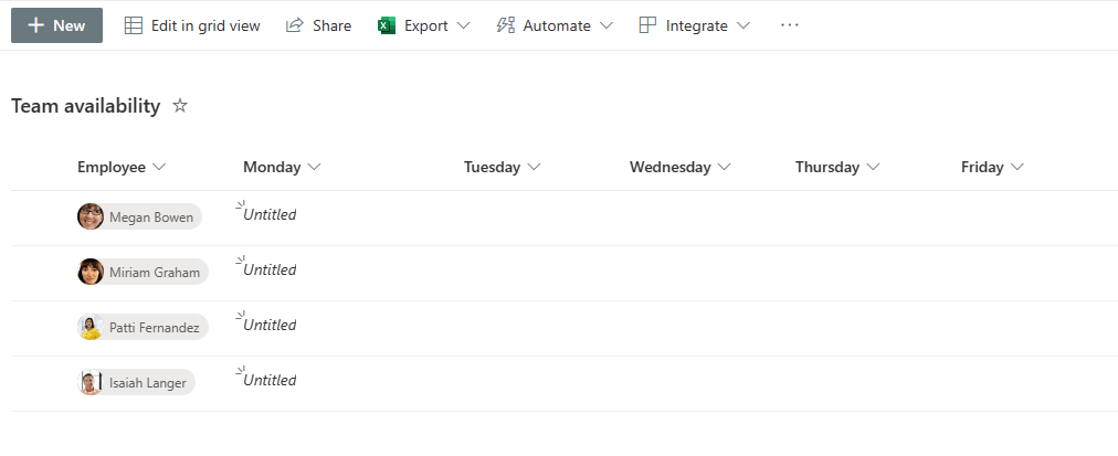 - Create a SharePoint List: Establish a SharePoint list for logging staff availability. Ensure it’s accessible to all staff members who will be participating and/or reviewing availability of teammates. It needs: